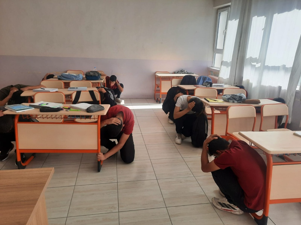 Etkinlik öncesinde öğretmenler tarafından sınıflarda yapılan bilgilendirme sunumlarıyla, öğrencilerimize “çök – kapan – tutun” hareketi, tahliye kuralları ve toplanma alanı düzeni hakkında bilgi verildi. Tatbikat sırasında deprem alarmının çalmasıyla birlikte tüm öğrenciler, planlanan şekilde sınıflarını kısa sürede ve kontrollü biçimde tahliye etti.